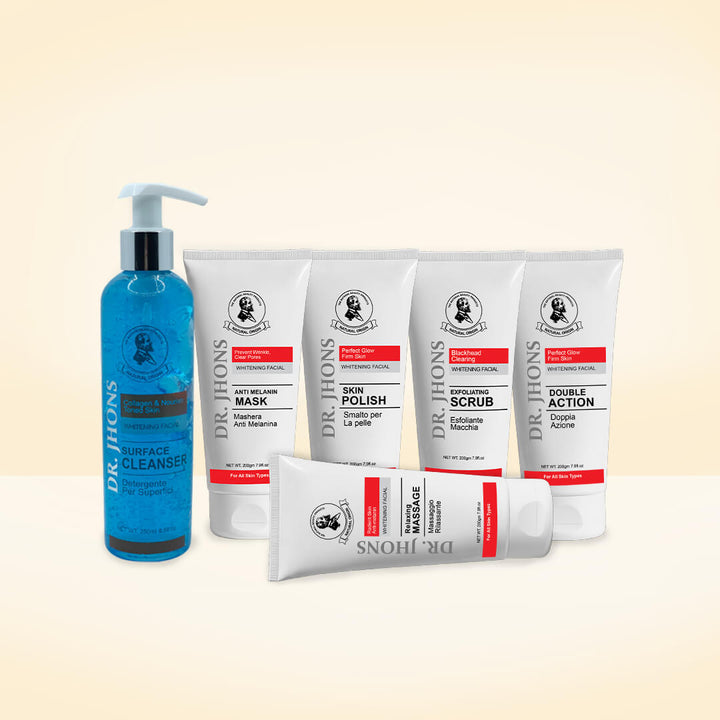 Reveal glowing, youthful skin with the Dr. Jhons Whitening Facial Kit (6 Steps). Specially formulated with brightening and anti-melanin actives, this professional-grade kit is designed to reduce dullness, clear pores, fight pigmentation, and restore radiance. Perfect for salon results at home, it helps improve skin texture while promoting a bright, even-toned complexion.